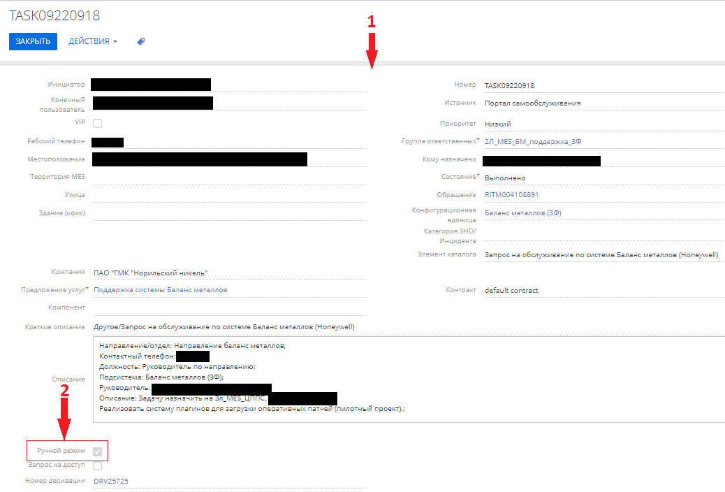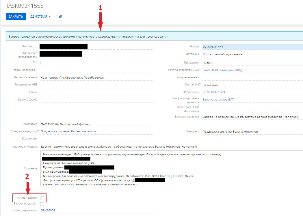 Для ЗНО и Инцидентов которые обрабатываются в рамках услуг Сервисной линии Поддержки систем промышленной автоматизации (далее СЛ ПСПА) требуется обращать внимание при закрытии своих рабочих заданий (далее РЗ) в каком режиме находится заявка, «автоматическом» или «ручном», для выбора корректного кода закрытия. Если Вы не являетесь сотрудником 2/3 линии поддержки СЛ ПСПА, то при нахождении обращения в «Ручном режиме» свои РЗ требуется закрывать с кодом «Выполнено, требуется доп. РЗ».